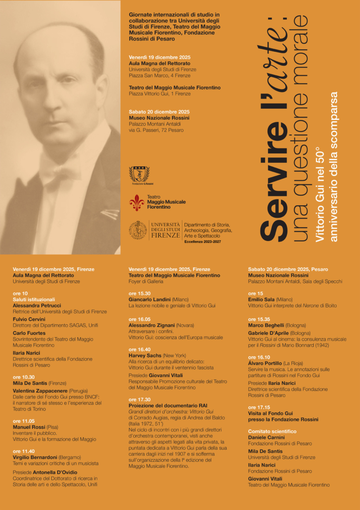 In occasione del 50° anniversario della morte di Vittorio Gui (Firenze, 19 dicembre 2025 – Pesaro, 20 dicembre 2025), l’Università degli Studi di Firenze, il Teatro del Maggio Musicale Fiorentino e la Fondazione Rossini organizzano due giornate di studi in programma venerdì 19 dicembre 2025 a Firenze e sabato 20 dicembre a Pesaro, nella Sala degli Specchi del Museo Nazionale Rossini,  a partire dalle ore 15.
